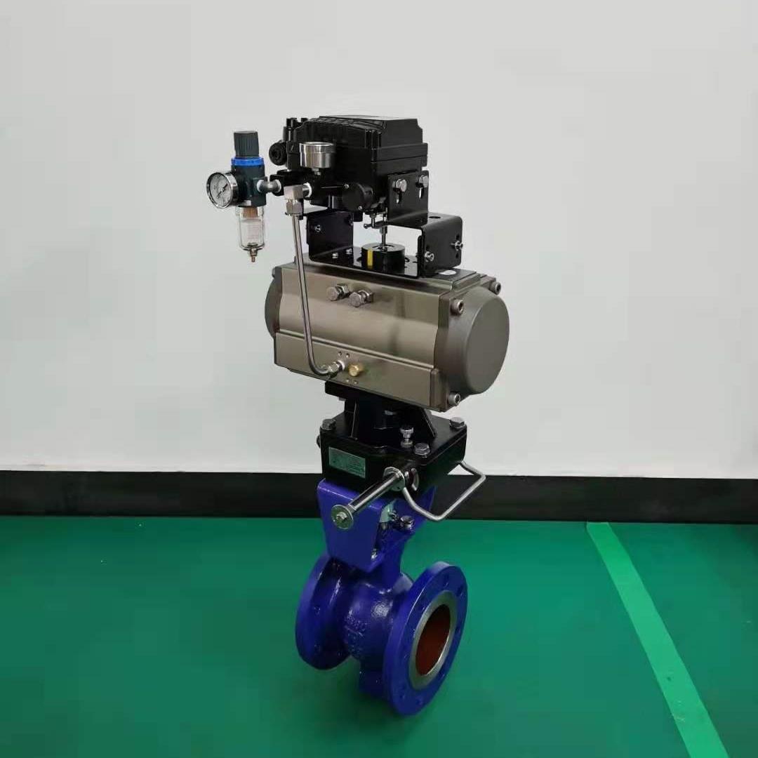 气动V型调节球阀又叫V型调节阀型号VQ640FY,英文ball valve ,是一种高性能球阀既可以作为调节阀又可以作为开关阀,设计结构紧凑,体积小,重量轻,密封可靠。V型结构阀芯,调节流量特性等百分比,还具有剪切功能,单向密封阀座。公称通径DN15-200,公称压力PN10-40,法兰标准HG20592