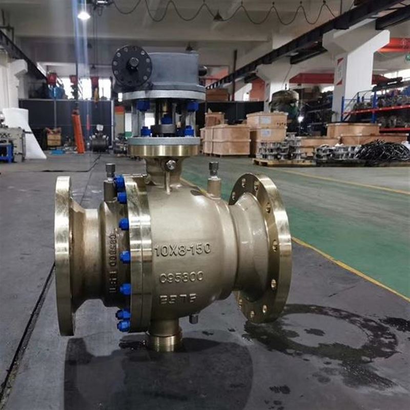 C95800镍铝青铜固定式变径球阀型号Q347F-150LB/10X8,RF法兰连接,二段式固定结构,O型球,涡轮蜗杆驱动,设计标准API 6D,结构长度ASME B16.10,法兰尺寸ASME B16.5,检查与试验API598,产品主要用于海水介质中,具有耐腐蚀优点,也可以适用同样环境腐蚀介质中使用,此款球阀性能优良,密封可靠,使用寿命长。可以加装气动/电动装置实现自动化控制。